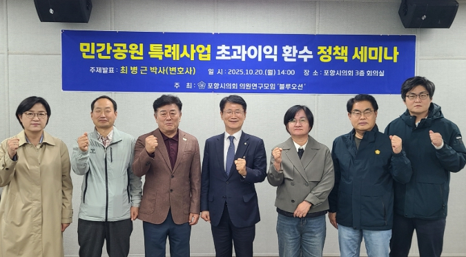 세미나에 참석한 블루오션 소속 의원들은 포항시의 민간공원 특례사업이 현재 협약 사항을 비공개로 유지하고 있어 시민의 알권리가 침해되고 있으며, 초과이익 환수의 타당성 조사에 대한 별도의 검증 절차가 필요하다는 데 의견을 모았다.