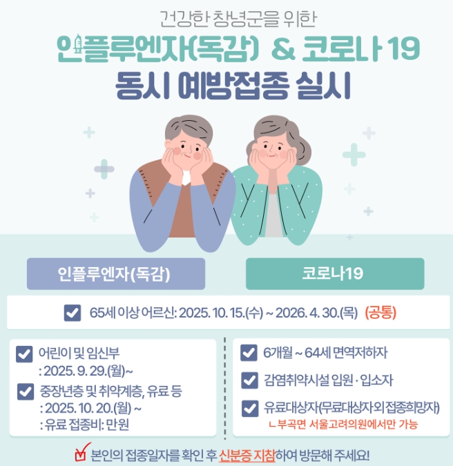 또한 군은 자체 사업으로 창녕군에 주소를 둔 ▲중장년층 60~64세 ▲국민기초생활수급자 ▲장애의 정도가 심한 장애인 ▲국가유공자 등 취약계층을 대상으로 무료 예방접종을 실시하고 있다.