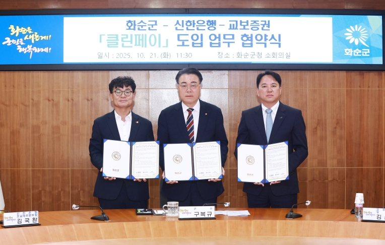 ![]() 화순군청 소회의실에서 화순군, 신한은행, 교보증권이 클린페이 도입 혁약하는 장면(왼쪽부터 김국환 신한은행 본부장, 구복규 화순군수, 김윤상 교보증권 상무) |