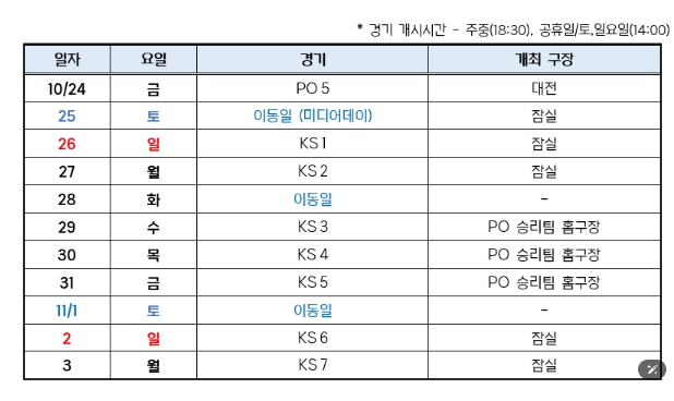 ![]() 2025 신한 SOL 뱅크 KBO 포스트시즌 일정표 |