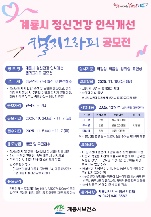 보건소 관계자는 “이번 공모전을 통해 정신건강에 대한 인식이 보다 긍정적으로 확산되길 바란다”며 “전국민이 마음 건강의 소중함을 글씨로 표현하고 함께 공감할 수 있는 계기가 되길 기대한다”고 밝혔다.