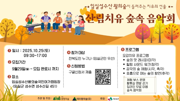 ![]() 임실군, 성수산 왕의숲 산림치유 숲속 음악회 |