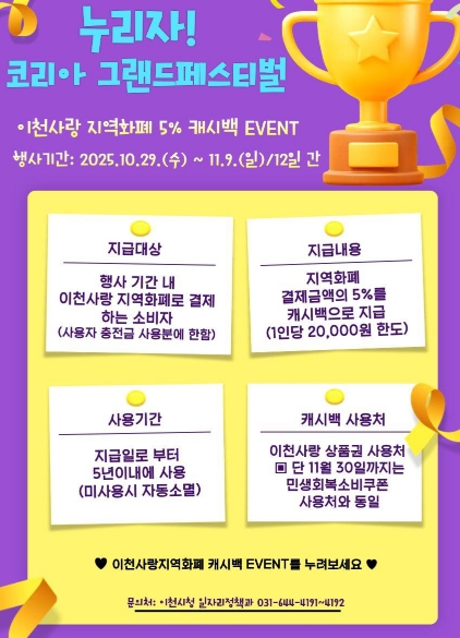 ![]() 이천사랑지역화폐, 캐시백 5% 이벤트…누리자! 코리아그랜드페스티벌 |