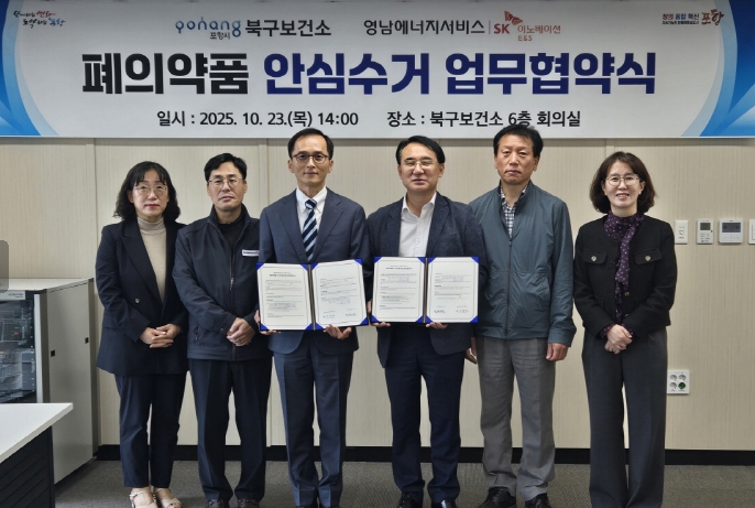 ![]() 포항시 북구보건소는 23일 영남에너지서비스와 함께 ‘폐의약품 안심수거 협력’을 위한 업무협약을 체결했다. |
