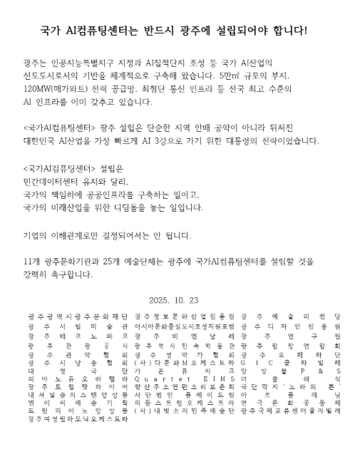 광주문화예술계는 “AI산업의 균형발전과 국가경쟁력 강화를 위해 광주에 국가AI컴퓨팅센터가 설립되어야 한다”며 “문화예술과 기술이 공존하는 창의도시 광주에서 대한민국 AI산업의 새로운 도약이 시작되길 바란다”고 덧붙였다.
