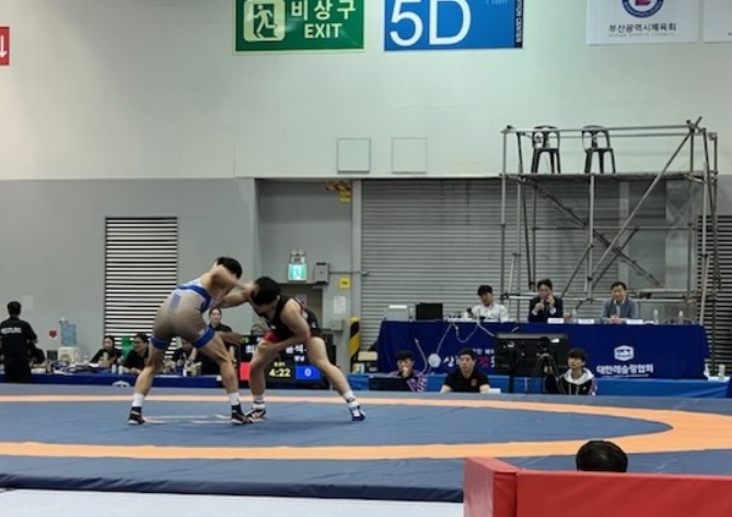 ![]() 제106회 전국체육대회 레슬링 경기에서 정용석 선수(오른쪽)가 상대 선수와 치열한 경합을 벌이고 있다. |