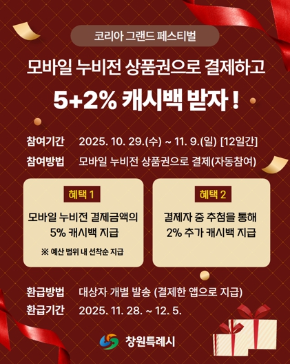 ![]() 창원특례시,‘모바일 누비전’결제 시 5+2% 캐시백 지급 |