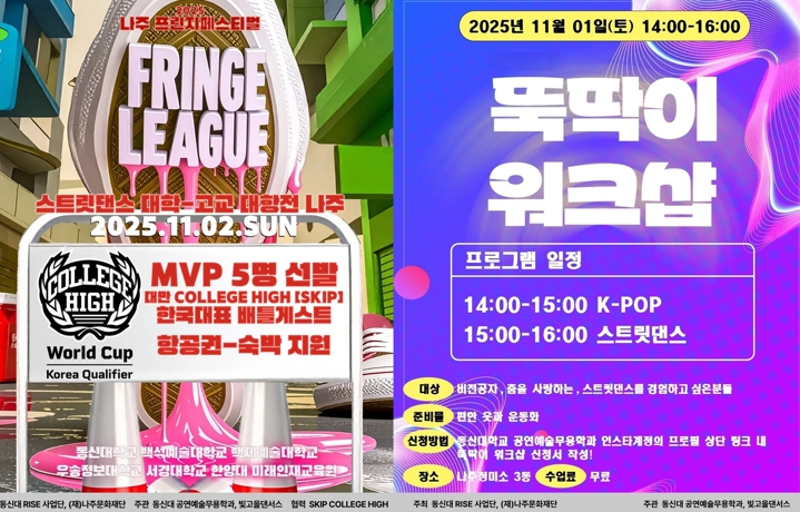 ![]() 나주문화재단이 오는 11월 1일부터 2일까지 나주정미소에서 ‘2025 나주 프린지 페스티벌 프린지리그’를 개최한다. |