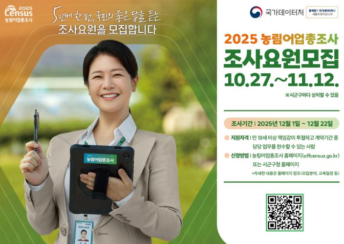 ![]() 남원시, 2025 농림어업총조사 조사요원 모집 |