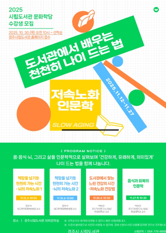 ![]() 경주시립도서관 문화학당 ‘도서관에서 배우는 천천히 나이 드는 법’ |