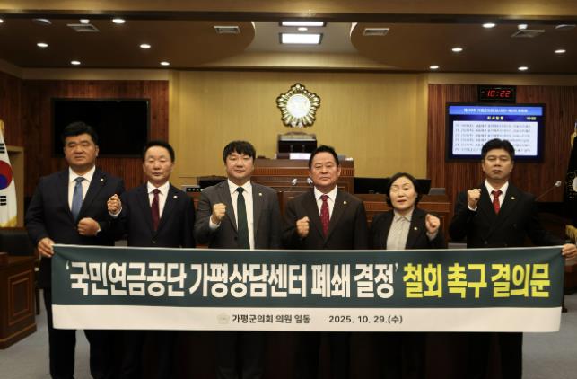 아울러, 국민연금공단의 가평상담센터 폐쇄 결정에 대한 즉각적인 재검토 및 철회를 촉구하기 위해 ▲'국민연금공단 가평상담센터 폐쇄 결정 철회 촉구 결의문'(김종성 의원 대표 발의)을 채택했다.
