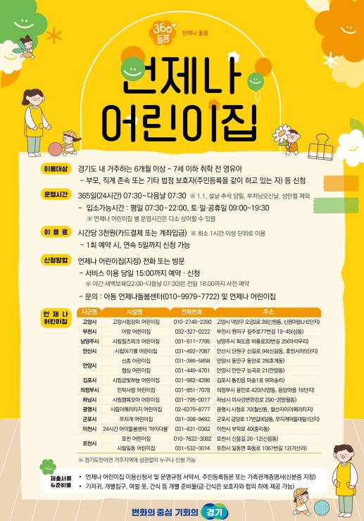 360° 언제나돌봄 ‘언제나 어린이집’은 평일뿐 아니라 주말과 공휴일, 야간․새벽까지 365일(24시간) 운영하는 보육시설로, 긴급상황이나 가족 돌봄 공백 등으로 돌봄이 필요할 때 언제든 안심하고 자녀를 맡길 수 있는 긴급돌봄시설이다.