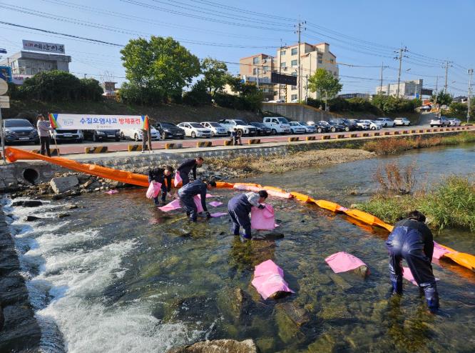 이번 훈련은 수질오염사고 발생 시 신속한 방제 및 대응능력 향상을 위해 실시된 것으로, 구청 공무원 등이 참여했다.