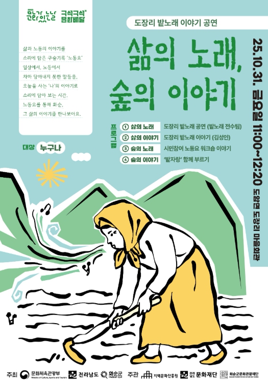 (재)화순군문화관광재단은 오는 10월 31일 오전 11시부터 12시 20분까지 화순 도암면 도장리 마을회관에서‘삶의 노래, 숲의 이야기’ 공연을 개최한다고 밝혔다.