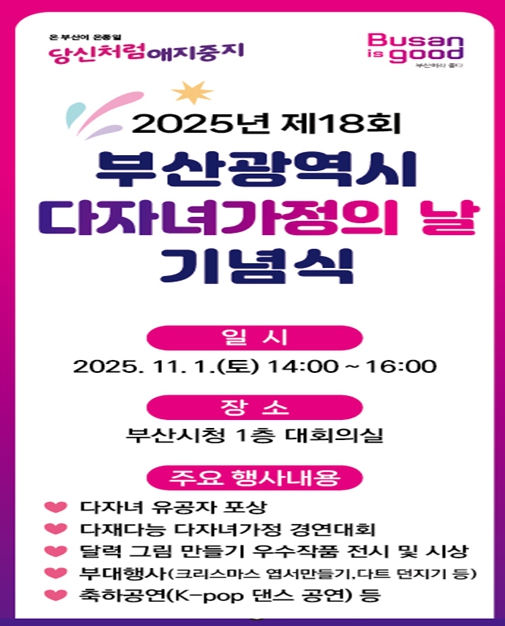 한편, 시는 다자녀가정의 기준을 2023년 10월부터 3자녀 이상에서 2자녀 이상으로 확대했으며, 부산시의 다자녀가정은 14만 5천여 세대이다.