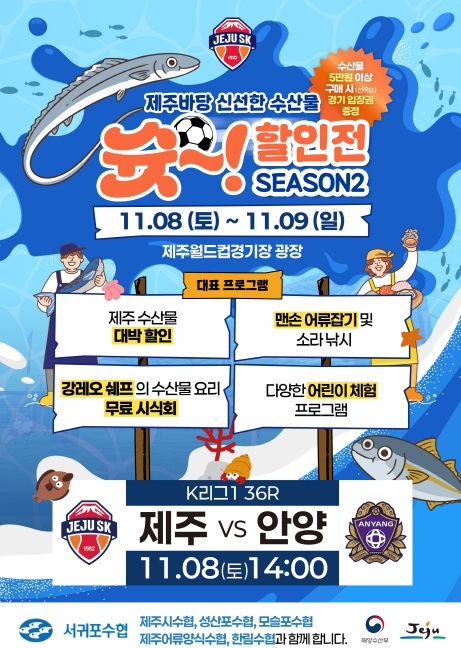 특히 8일에는 제주 SK FC와 FC 안양의 경기와 연계한 특별 이벤트가 준비돼 있다. 행사 참여자 전원에게 입장권 6,000원 할인쿠폰이 제공되며, 경기 하프타임에는 100만원 상당의 수산물 세트와 유니폼 등을 증정하는 경품 추첨과 선수 사인회가 진행된다.