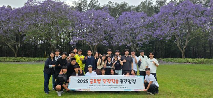 ![]() 울산교육청 관계자들이 1일 호주 시드니에서 '직업계고 해외 현장학습' 중간 점검을 하고 학생들과 기념사진을 찍고있다 |
