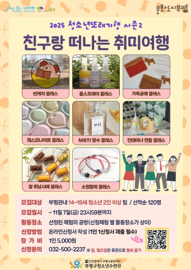 ![]() 부평구청소년수련관, 2025 청소년또래기행 시즌2‘친구랑 떠나는 취미여행’참가자 모집 |
