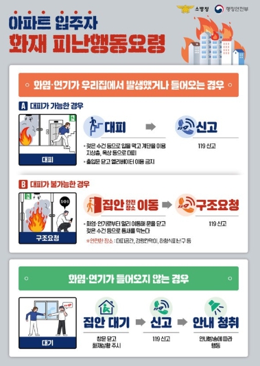 이처럼 침착하게 대피공간으로 피신해 구조를 기다린 사례는 매우 적절한 대응으로, 실제 화재 상황에서는 무작정 탈출하기보다 상황에 맞는 판단이 무엇보다 중요하다. 이에 따라 예전에는 공동주택 화재 시 대피 요령으로 “불나면 대피 먼저”를 강조했지만, 최근에는 “불나면 살펴서 대피”로 지침이 바뀌었다. 복도나 계단에 불길이나 연기가 가득할 경우에는 문을 닫고 대피공간, 경량칸막이, 하향식 피난구 등 피난 시설을 활용해 실내에서 구조를 기다리는 것이 더 안전할 수 있다.