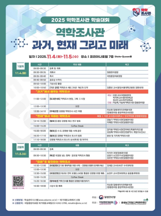 첫째 날인 11일에는 역학조사관 양성에 기여한 전문가에 대한 공로상 시상을 시작으로, 우리나라 첫 번째 역학조사관 중 1명이었던 분당서울대학교병원 김홍빈 교수의 ‘역학조사 제도 25년, 혁신과 도약’ 기조 강연, 토크콘서트 ‘역학조사 현장, 그때 그 시절’ , 질병관리청 중앙역학조사반장 이상원 국장의 ‘감염병 역학조사 시간 여행’ 강연이 이어진다.