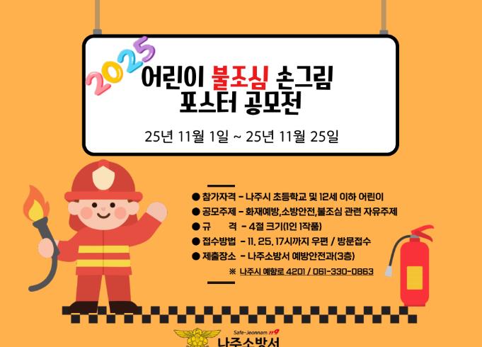 ![]() 나주소방서, 2025년 어린이 불조심 포스터 공모전 개최 |
