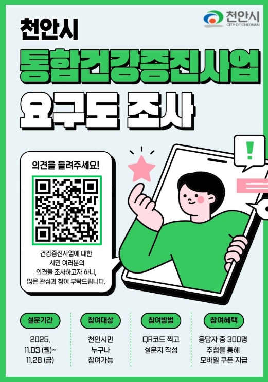 ![]() 1. 천안시보건소 지역사회 통합건강증진사업 주민요구도 조사 홍보문. |