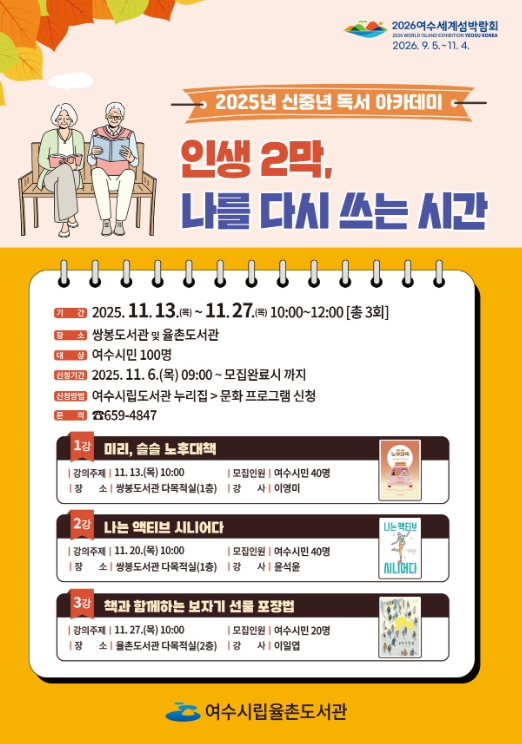 참여 신청은 11월 6일부터 여수시립도서관 누리집을 통해 가능하며 행복한 노후 설계에 관심 있는 여수시민 누구나 무료로 참여할 수 있다.