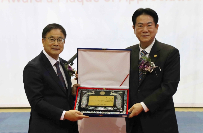 ![]() 윤웅석 국기원장이 이동섭 전 국기원장에게 감사패를 전달하고 기념촬영을 하고 있다. |