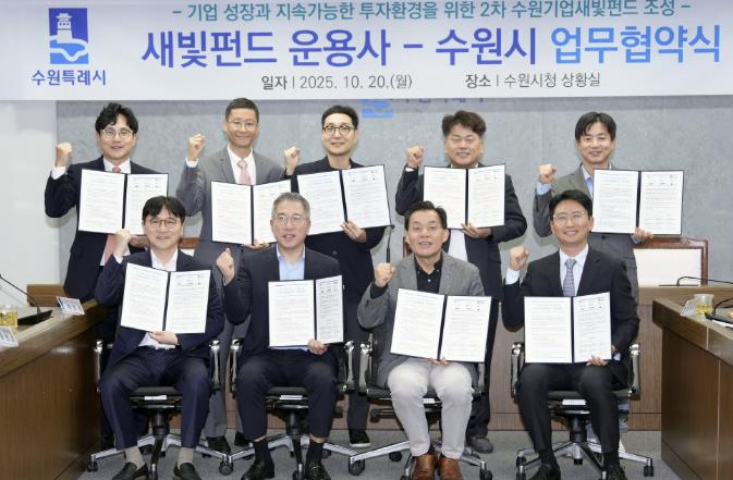 ![]() 지난 10월20일 이재준 수원특례시장과 2차 새빛펀드 운용사 관계자들이 업무협약식 후 기념촬영을 하고 있다. |