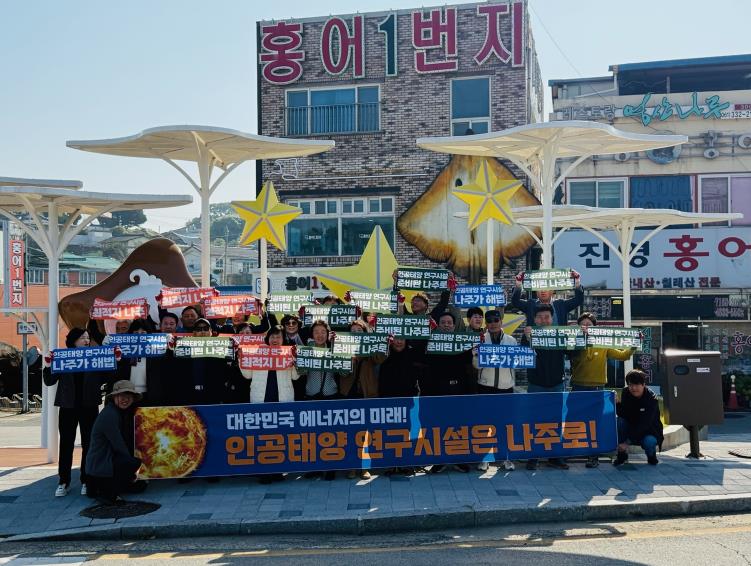 ![]() 영산포 홍어거리에서 영산동 통장협의회가 ‘인공태양 연구시설 나주 유치’ 캠페인을 진행하고 있다. |