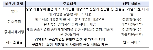 기업의 특성과 필요에 따라 4가지 유형(①일반, ②탄소중립, ③중대재해예방, ④재기컨설팅)으로 구분하며, 유형별로 기업 특성에 맞춘 3개 서비스(컨설팅·기술지원·마케팅)를 바우처 방식으로 지원할 예정이다.