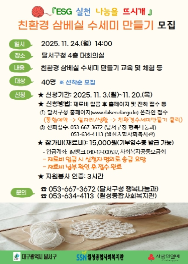 이태훈 달서구청장은 “이번 활동은 환경과 이웃을 함께 생각하는 ESG 실천의 장으로, 작은 손길이 모여 큰 변화를 만드는 따뜻한 나눔의 시간이 되기를 바란다”고 말했다.