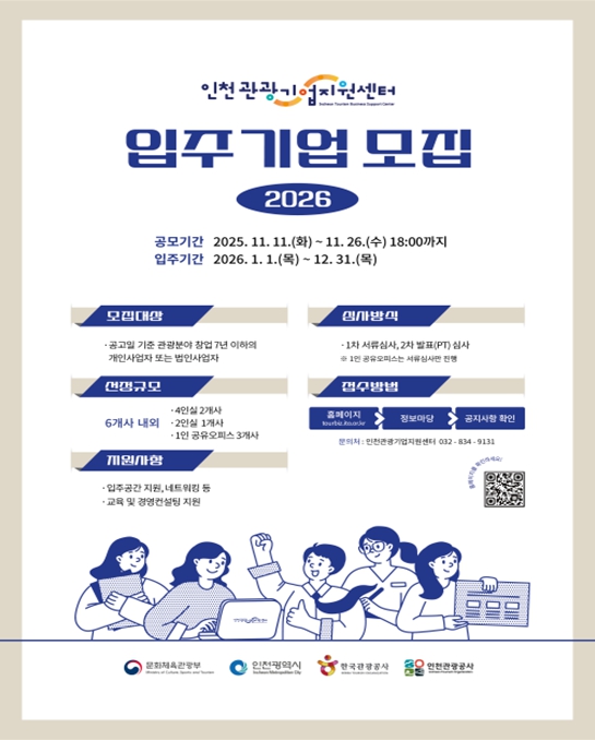 신청은 인천관광기업지원센터 홈페이지에서 신청서식을 다운받아 작성한 후, 11월 26일 18시까지 접수처 이메일로 제출하면 된다.