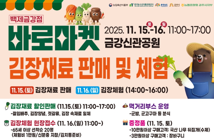 ![]() ‘바로마켓 백제금강점’ 김장재료 할인 판매 및 체험행사 개최 |