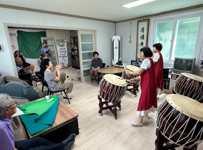 ![]() 찾아가는 마을극장 프로그램으로 예주줌마 난타 공연이 펼쳐지고 있다. |
