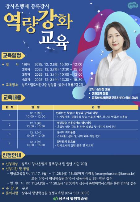 ![]() 상주시, 2025년 강사은행제 등록강사 역량강화 교육 수강생 모집 |