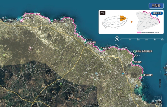 ‘구좌 숨비해안로’는 제주 해녀 공동체의 삶과 문화를 상징하는 ‘숨비’와 해안도로의 이미지를 결합해 이름 붙여졌다. 김녕해수욕장에서 종달두문포 교차로까지 총연장 24.77km 구간으로, 제주 동부 해안의 절경과 해녀 문화가 공존하는 노선이다.