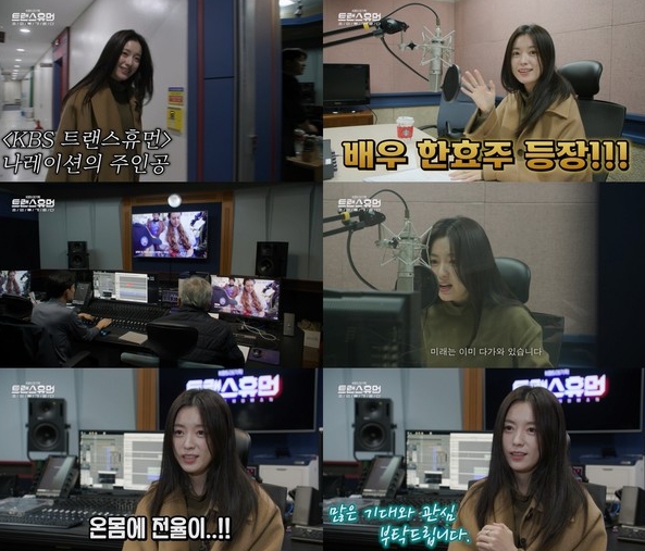 'KBS 다큐' 유튜브 채널에 올라온 메이킹 필름 영상에서는 밝은 표정으로 녹음실에 들어선 한효주가 꾸미지 않은 내추럴한 미모로 먼저 감탄을 자아냈다.