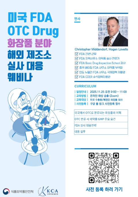 ![]() ‘미국 FDA OTC Drug 화장품 분야 해외 제조소 실사 대응 교육(웨비나)’ 포스터 |