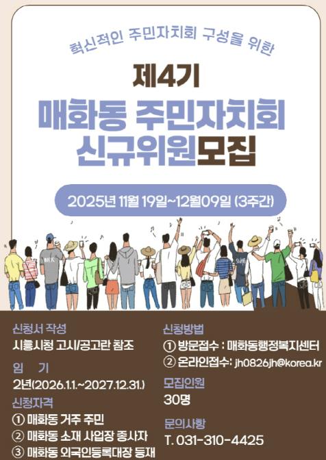 제3기 매화동 주민자치회의 임기(2024.01.01.~2025.12.31.)가 만료됨에 따라 '시흥시 주민자치회 및 주민자치센터 설치·운영에 관한 조례'에 기반한 매화동 발전의 혁신적인 마인드를 가진 제4기 신규위원을 선발하며 위원 임기는 2년이고 중도 해촉이 가능하다.