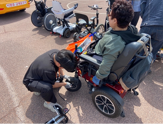 ![]() 장애인보조기기 수리지원(전동휠체어 타이어 교체) 작업 장면 |