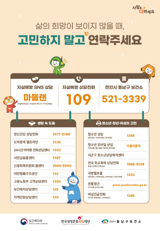 한편 삶에 희망이 보이지 않을 때는 고민하지 말고 24시 자살예방 상담전화(109), 천안시 동남구 자살예방센터, 서북구 자살예방센터 연락하면 전문적인 상담과 도움을 받을 수 있다.