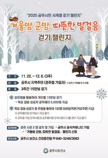 ![]() 공주시, ‘겨울밤 군밤, 따뜻한 발걸음’ 걷기 챌린지 운영 |