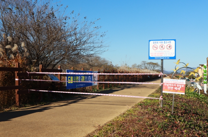 ![]() 주남저수지 생태탐방로 진입로에 차단띠가 둘러져 있다. |