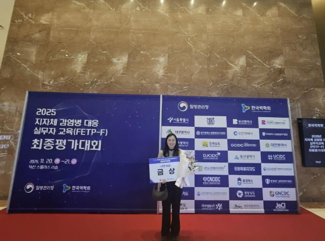 20~21일 스플라스 리솜(예산군)에서 열린 2025년 FETP-F(감염병 대응 실무자교육) 담당자 과정 최종 평가대회에서는 요양원 CRE 집단 발생의 위험 요인을 분석하고, 이에 대한 보건소 예방·관리 중재 활동을 설계·시행한 사례를 공유해 금상을 받았다.