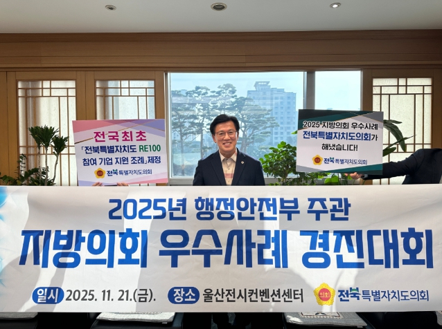 문승우 의장은 “일 잘하는 의회, 함께 만드는 전북을 위해 끊임없이 혁신하고 노력해 온 점을 인정받아 매우 기쁘다”며 “앞으로도 의원들의 의정활동을 적극적으로 지원해 전북 발전에 힘을 보태겠다”고 밝혔다.