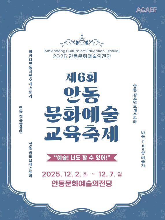 음악 프로그램에는 △12월 4일 19시 30분 ‘마카다안동시민오케스트라’ △5일 19시 30분 ‘안동 청춘합창단’ △6일 14시 ‘안동 꿈의오케스트라’ △6일 19시 ‘안동 청소년오케스트라’가 참여한다. 각 단체는 약 10개월 동안 꾸준한 합주와 교육을 거쳐 완성도 높은 무대를 준비해 왔으며, 오케스트라와 합창이 어우러진 풍성한 정기연주회를 안동문화예술의전당 웅부홀에서 선보일 예정이다.