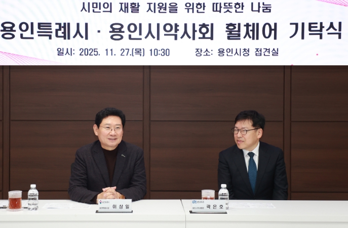 ![]() 용인특례시와 용인시약사회의 휠체어 기탁식에서 인사말을 하고 있는 이상일 용인특례시장(왼쪽)과 곽은호 용인시약사회장(오른쪽) |