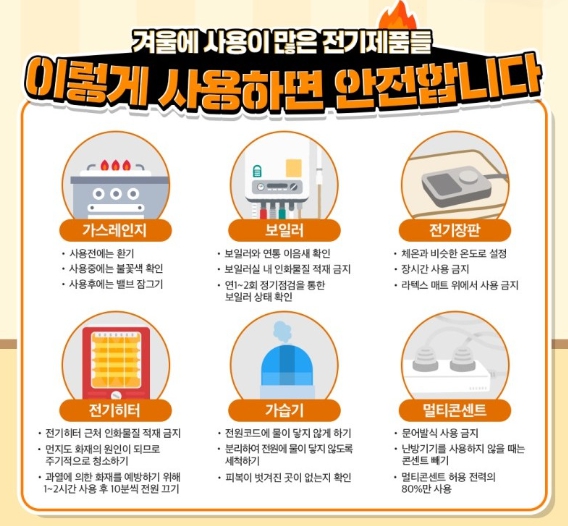 겨울철에는 전기제품 사용량이 늘면서 멀티탭 과부하 사고가 반복되는 만큼 전기 안전도 함께 챙겨야 한다. 파주소방서는 하나의 멀티탭에 여러 기기를 꽂아 사용하는 문어발식 사용을 피하고, 난방기처럼 소비전력이 큰 제품은 단독 콘센트에 연결해 줄 것을 권했다. 플러그 주변에서 타는 냄새가 나거나 색이 변한 흔적이 보인다면 바로 교체해달라는 안내도 덧붙였다.