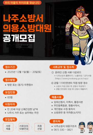 ![]() 나주소방서, 2025년 하반기 의용소방대 신규대원 모집 나서 |